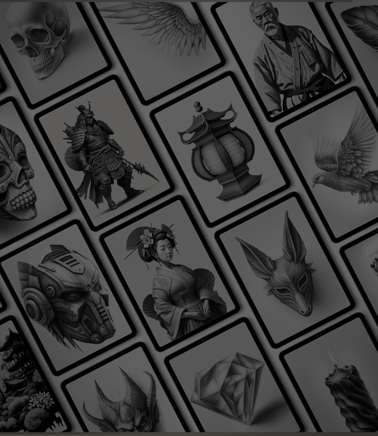 - Als Pinselstempel : Importieren Sie unsere Referenzdesigns ganz einfach als Pinselstempel in Procreate oder Sketchbook. Mit dieser Funktion können Sie das Design schnell auf Ihrer Leinwand platzieren, die Größe ändern und es direkt in Ihr Kunstwerk integrieren. Egal, ob Sie an Tattoo-Layouts oder digitaler Kunst arbeiten, die Möglichkeit, diese Referenzen zu stempeln, beschleunigt Ihren Arbeitsablauf und eröffnet endlose Gestaltungsmöglichkeiten.