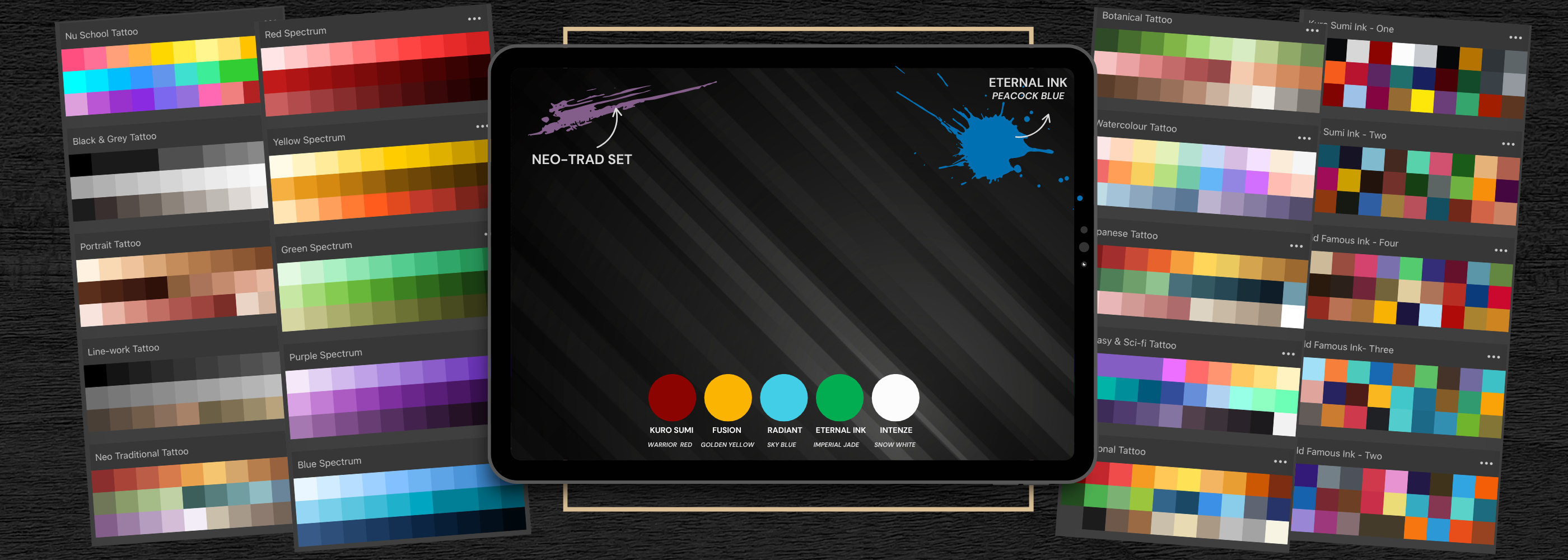 Procreate palettes including real ink brands and tattoo style spectrums — designed for perfect color planning.