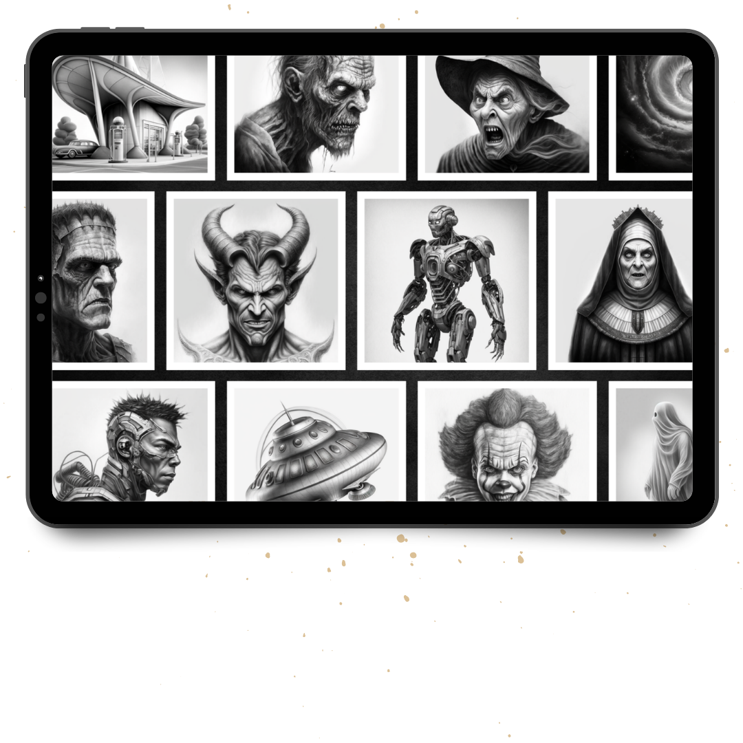 Skeletal anatomy, distorted figures, hybrid creatures, gothic compositions — built for controlled contrast execution.