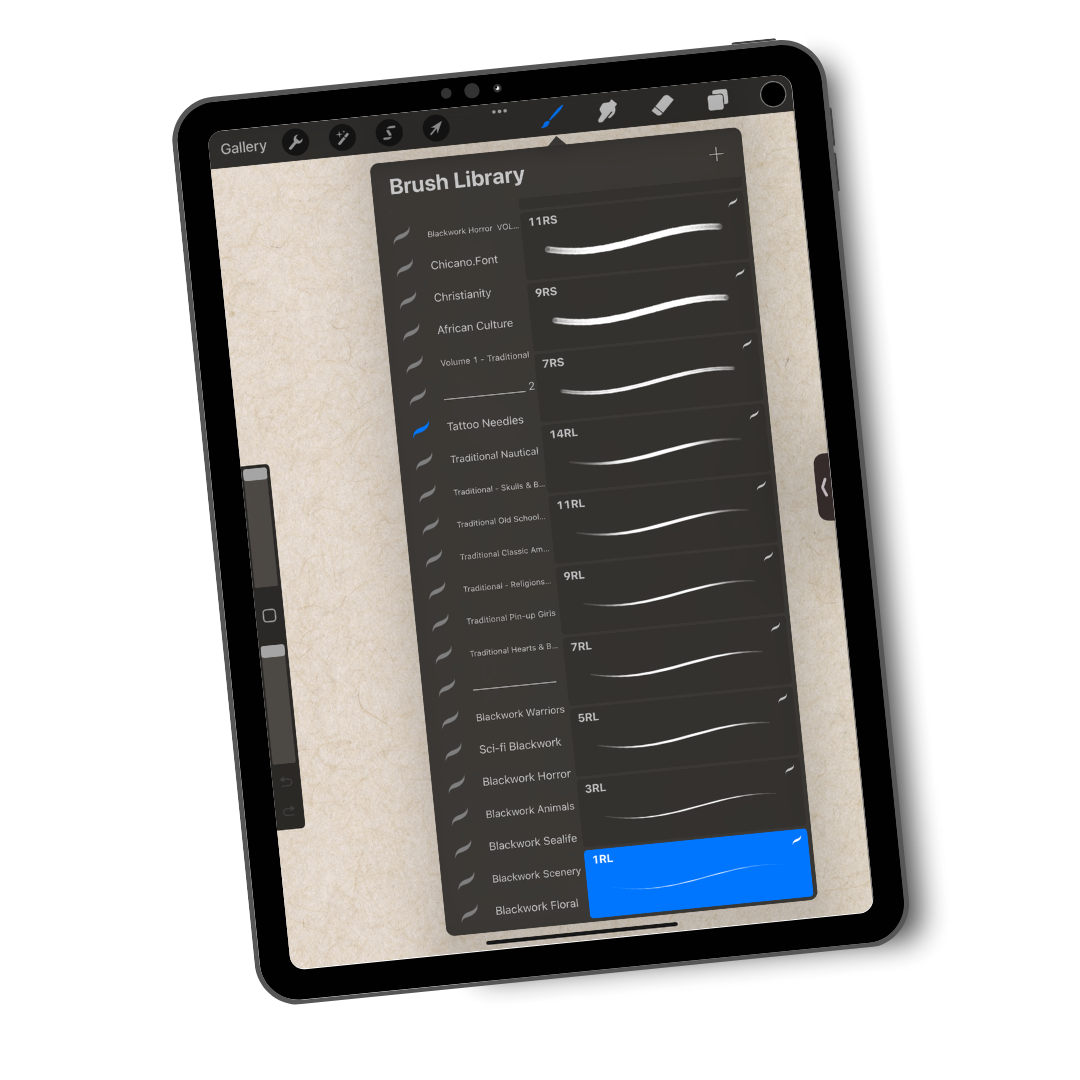 Procreate brush sets that replicate tattoo needles, stencil pens, and sketch liners. Designed to speed up your workflow and bring designs to life.